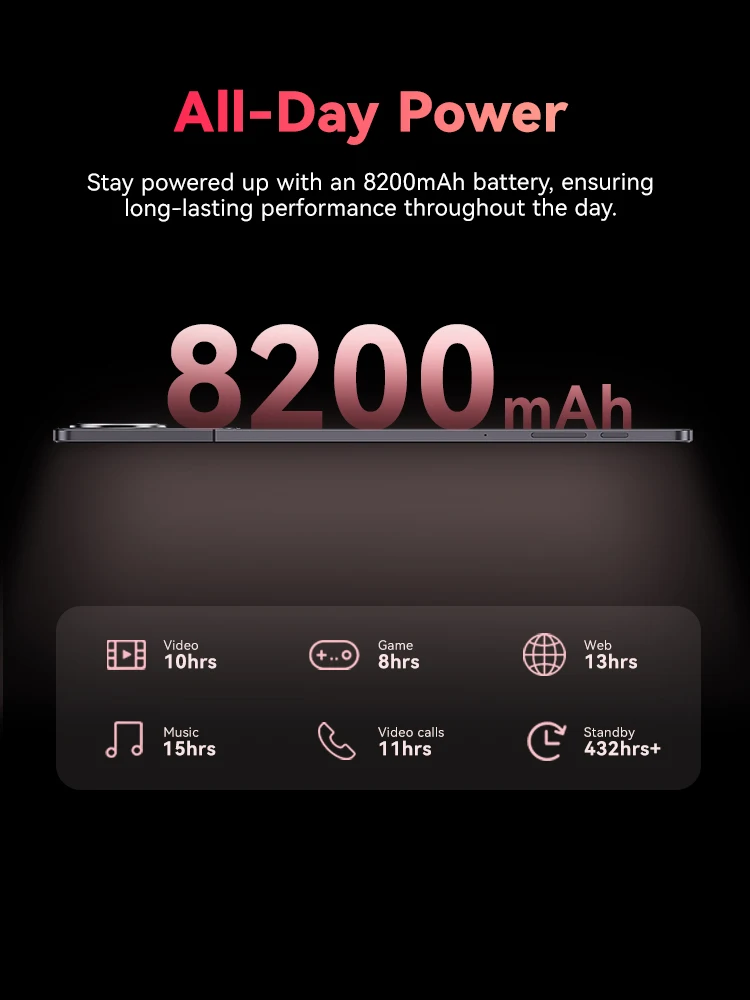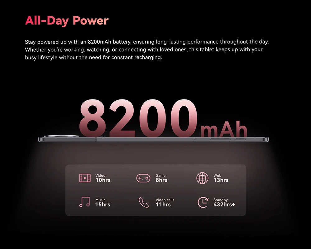 Stay powered up with an 8200mAh battery, ensuring long-lasting performance throughout the day. Whether you're working, watching, or connecting with loved ones, this tablet keeps up with your busy lifestyle without the need for constant recharging.
