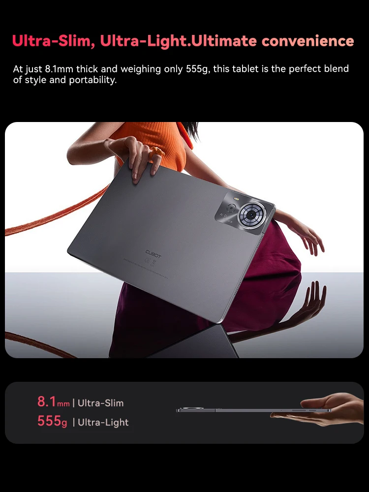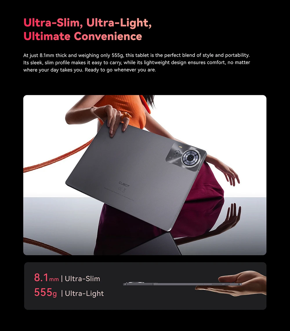 At just 8.1mm thick and weighing only 555g, this tablet is the perfect blend of style and portability. Its sleek, slim profile makes it easy to carry, while its lightweight design ensures comfort, no matter where your day takes you. Ready to go whenever you are.