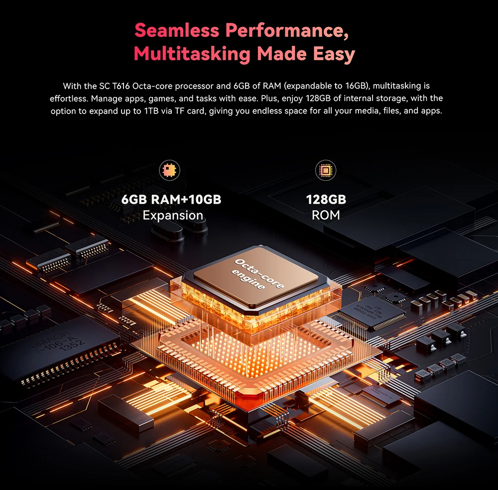 With the SC T616 Octa-core processor and 6GB of RAM (expandable to 16GB), multitasking is effortless. Manage apps, games, and tasks with ease. Plus, enjoy 128GB of internal storage, with the option to expand up to 1TB via TF card, giving you endless space for all your media, files, and apps.