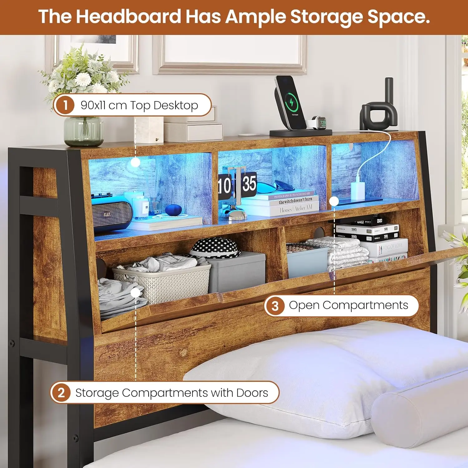 【Ample Storage Solutions】This single bed frame is designed with practical storage in mind, offering multiple ways to organise your bedroom: ①Bedtop Shelf: The flat top surface of the headboard is perfect for keeping bedtime essentials within easy reach. ②3 Open Compartments: Ideal for frequently used items like an alarm clock, glasses, or your phone while it charges. ③2 Enclosed Cabinets with Doors: Keep personal belongings or clutter out of sight, protected from dust for a tidier look. ④Generous Under-Bed Clearance: The metal single bed frame provides approximately 31 cm of clearance, offering ample space for storing suitcases, storage boxes, or seasonal footwear.