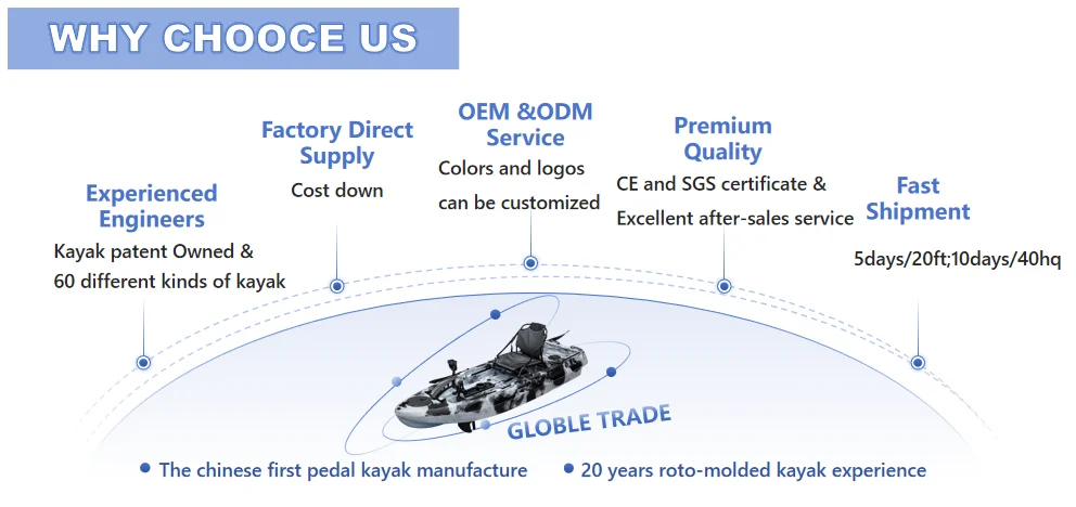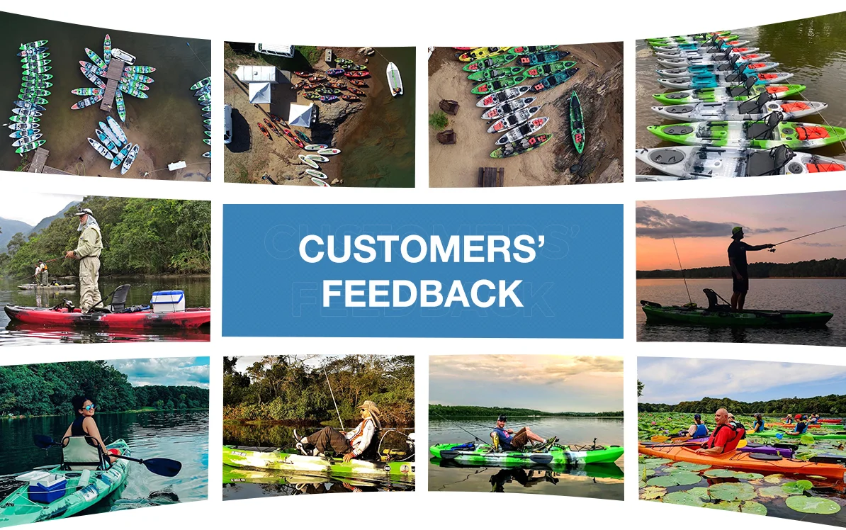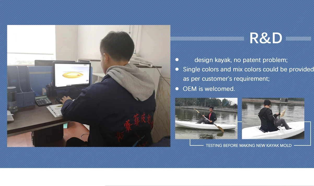 Q1: How many kayak molds does LSF have ? A1: We have 60 different kinds of kayaks, including pedal kayaks, fishing kayaks, motor kayak,single sit on top kayak, tandem kayak, family kayak, motorized kayak,sit inside sea kayak and racing kayak. Q2: What's your MOQ? A2: Our MOQ is usually one full 20ft container. LCL is not acceptable unless you have your own container leave from China as a sample order because of shipping cost. Q3: What colors are available? A3: Single colors and mix colors could be provided as per customer's requirement. Q4: Can I buy different types in one container? A4: Yes, you can mix different types in one container. Once choosed the items, just ask us for the container capacity. Q5: How do the products packed? A5: We usually pack the kayaks by Bubble Bag+ Carton Sheet + Plastic Bag,securely enough, also we can pack it by clients requirement. Q6: How do you assure the kayak’s quality? A6: Our QC department inspect each of kayak strictly to ensure all of kayak are good quality; Water test before package; 3 Year warranty for kayak hull; 24 hours feedback for customer’s enquiry. Q 7: Why choose LSF Kayak as supplier ? A7: No patent issue; More than 20 years of roto molded kayak manufacturing experience; Strict quality standard; 60 different kinds of kayak, OEM service.