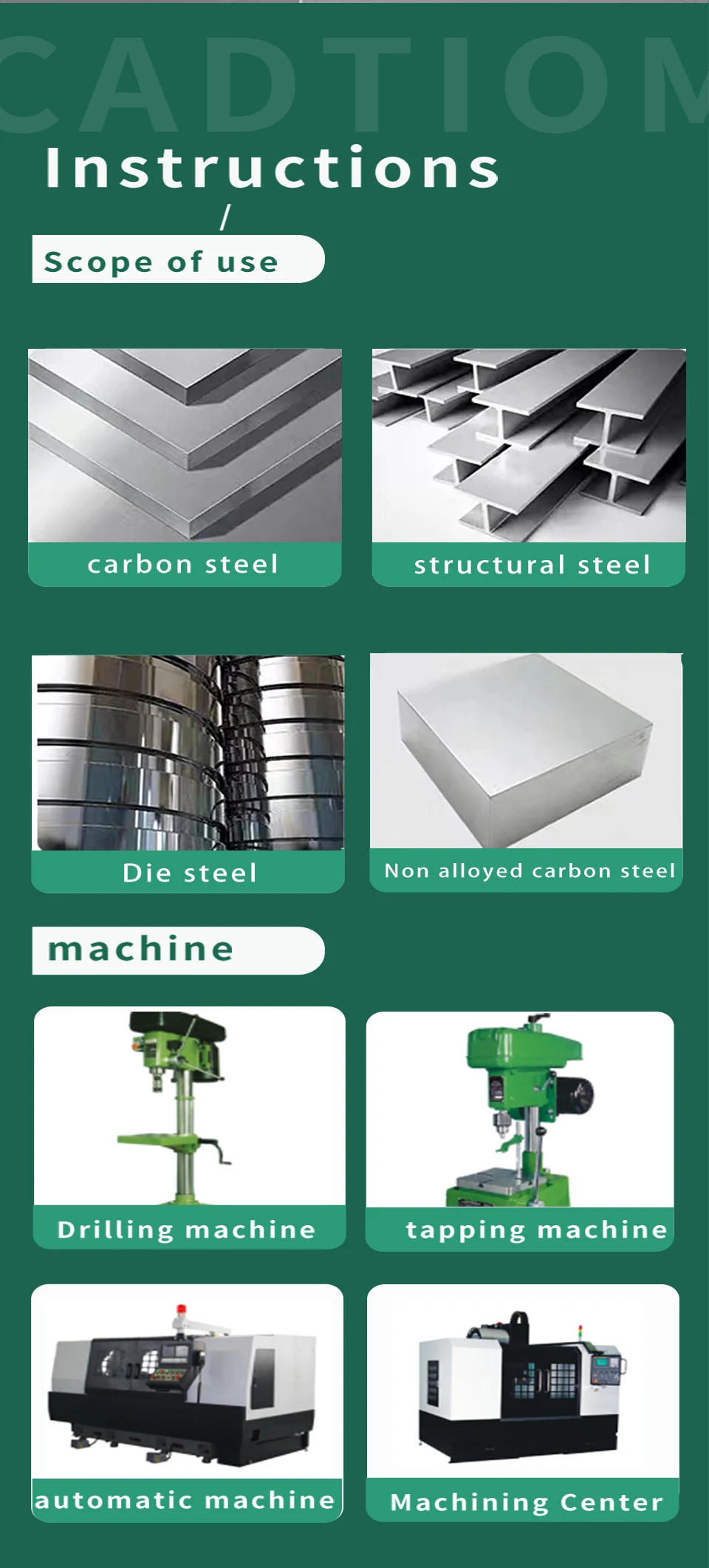 Applicable processing materials: steel, copper, iron, aluminum, aluminum alloy, etc.