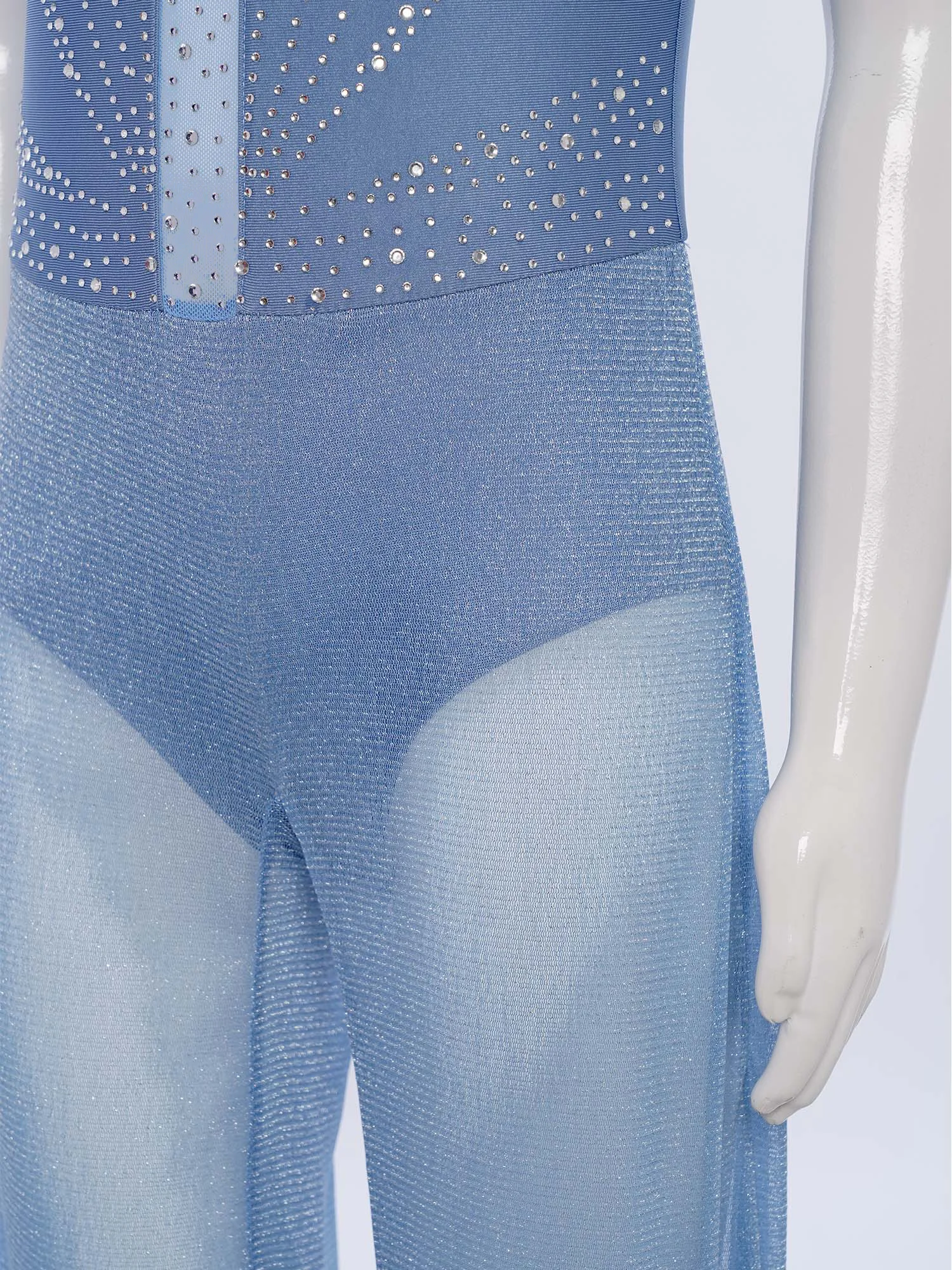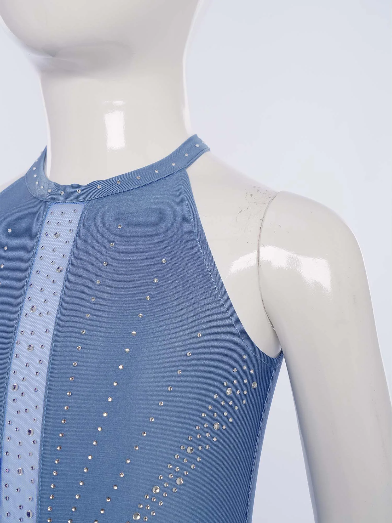The shiny sequins bodice and shimmery mesh bottom create a dazzling effect under the stage lights, enhancing the performance atmosphere.