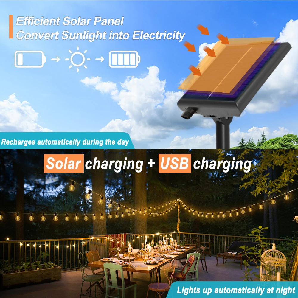 These solar string lights can work up to 16 hours after full charging by sunlight. A 180 degree adjustable panel allows you to get the optimum sun exposure. The USB charge can be complementary when there is no sufficient sunlight during the day