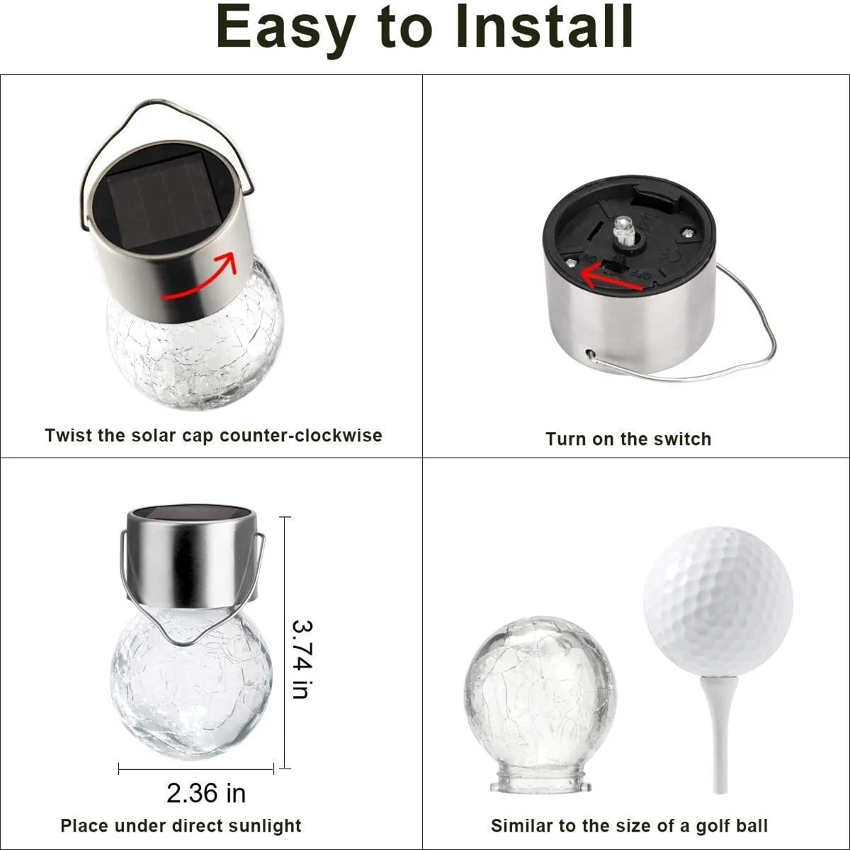 【Easy Installation】Just turn the switch in the “ON” position, then hang the lamp on a place where it can absorb direct sunlight. The hanging solar path lights automatically charge in the daylight, turn on at dusk and turn off at dawn.