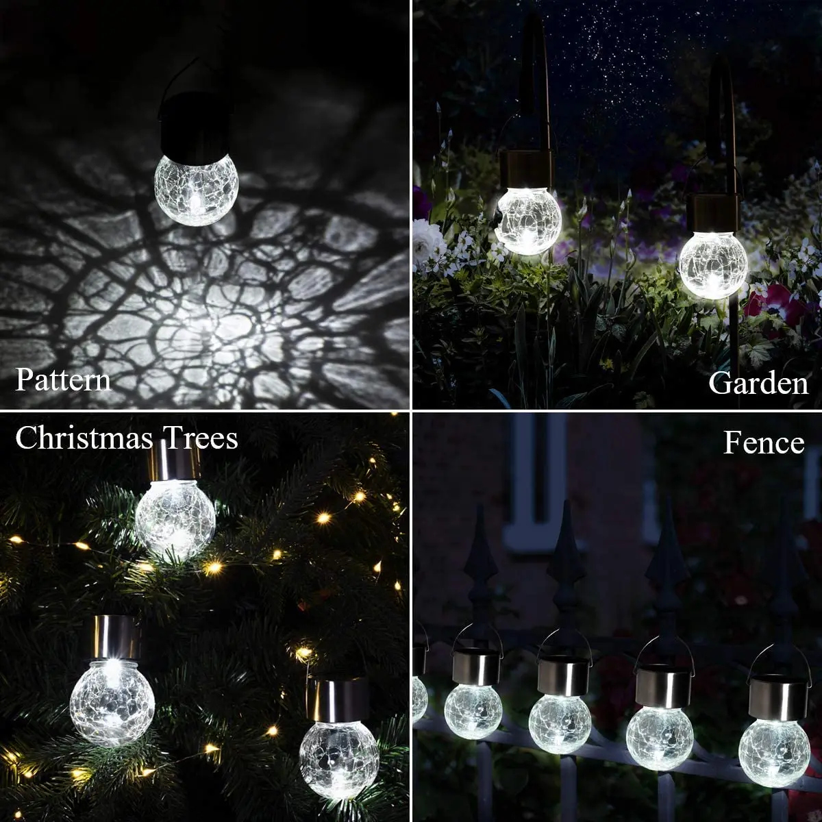 【Premium Material】The hanging solar lights are made of solid crackle glass globe, sturdy stainless steel and bright white LED. On a full charge, hanging solar ball lights stay lit for up to 8 hours and decorate a delightful glow to your path, yard, garden, and patio at night.