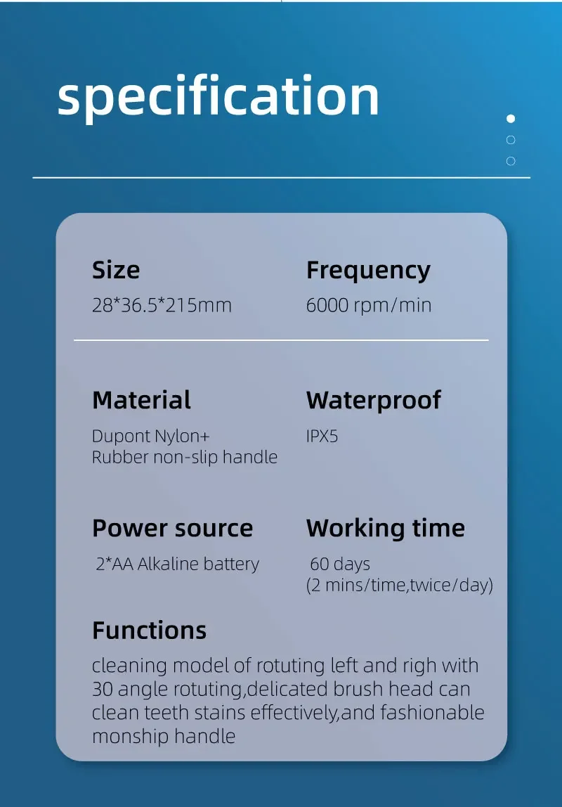 1. This electric toothbrush can directly touch each tooth, flush and clean the blind area in the oral cavity, and efficiently clean the teeth, achieving the effect of whitening teeth and refreshing breath.