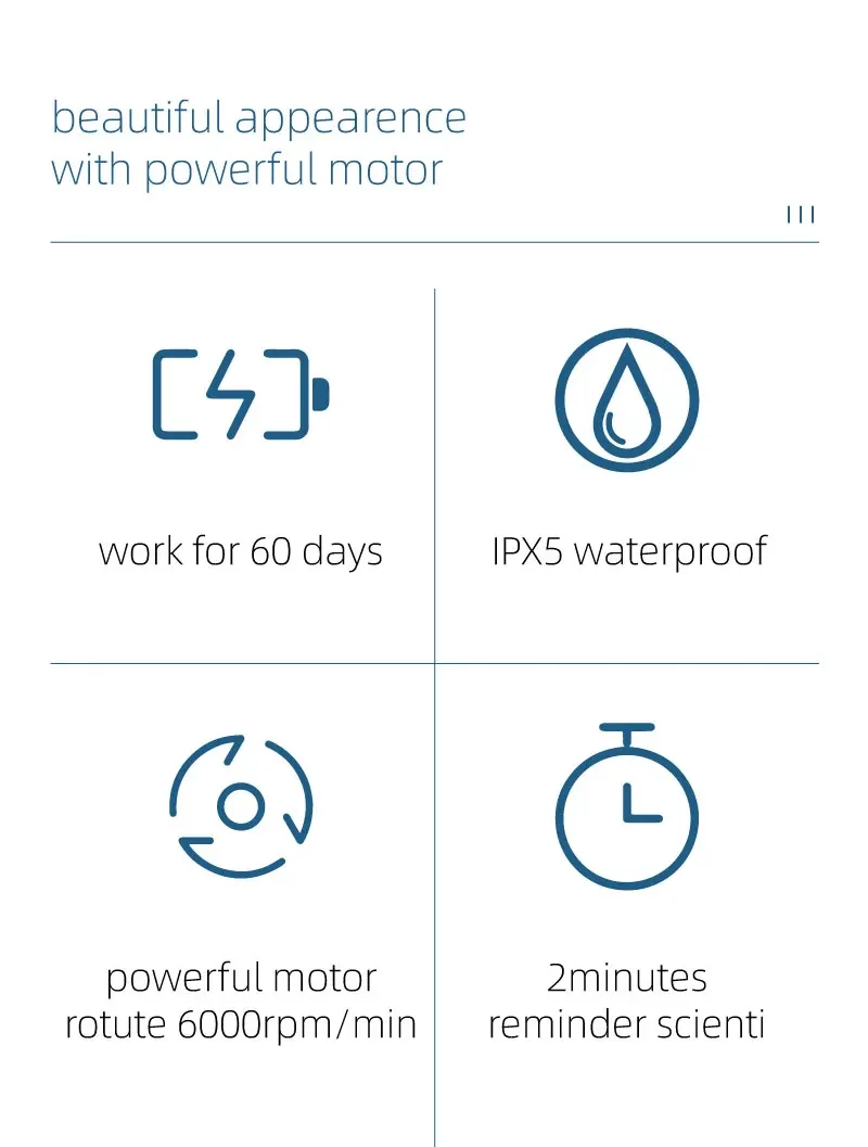 4. Intelligent timing: 30s to change zone reminder, remind you of cleaning actions in different areas; 2min timing reminder, let you develop the habit of scientific tooth brushing.