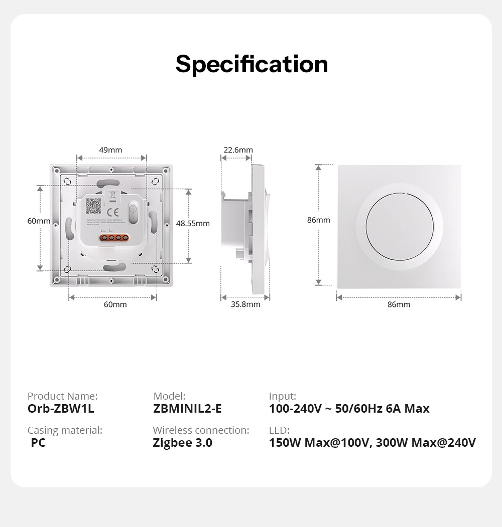 SONOFF Orb-ZBW1L Zigbee Smart Wall Switch Fusion Series ZBMINIL2-E No Neutral Required Seamless Integration With Home Assistant
