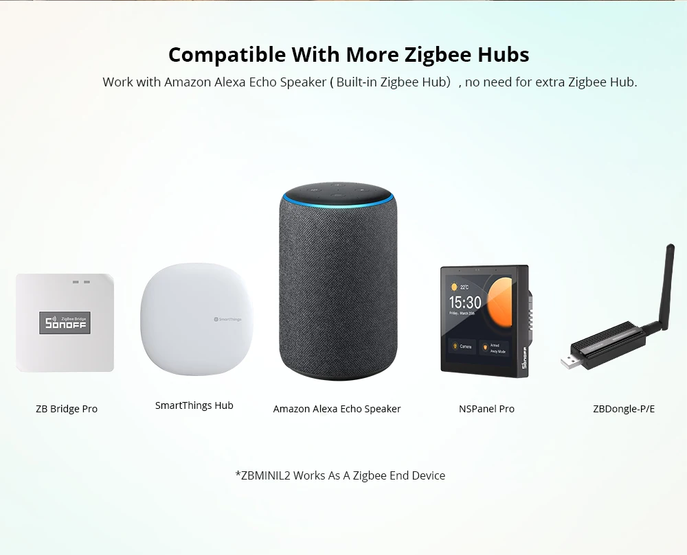 Work with Amazon Alexa Echo Speaker (Built-in Zigbee Hub), no need for extra Zigbee Hub.