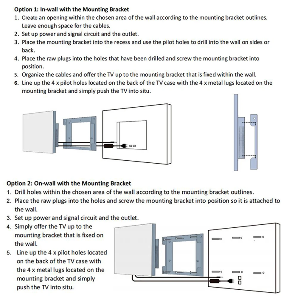 For the models that are designed to be installed and recessed into your wall. It therefore requires a cavity to be cut into your wall, with size of cavity depend on the size of television you purchase. It is recommended that power and input cables are made available adjacent to the cavity opening inside the cavity. This will give you a seamless looking installation.