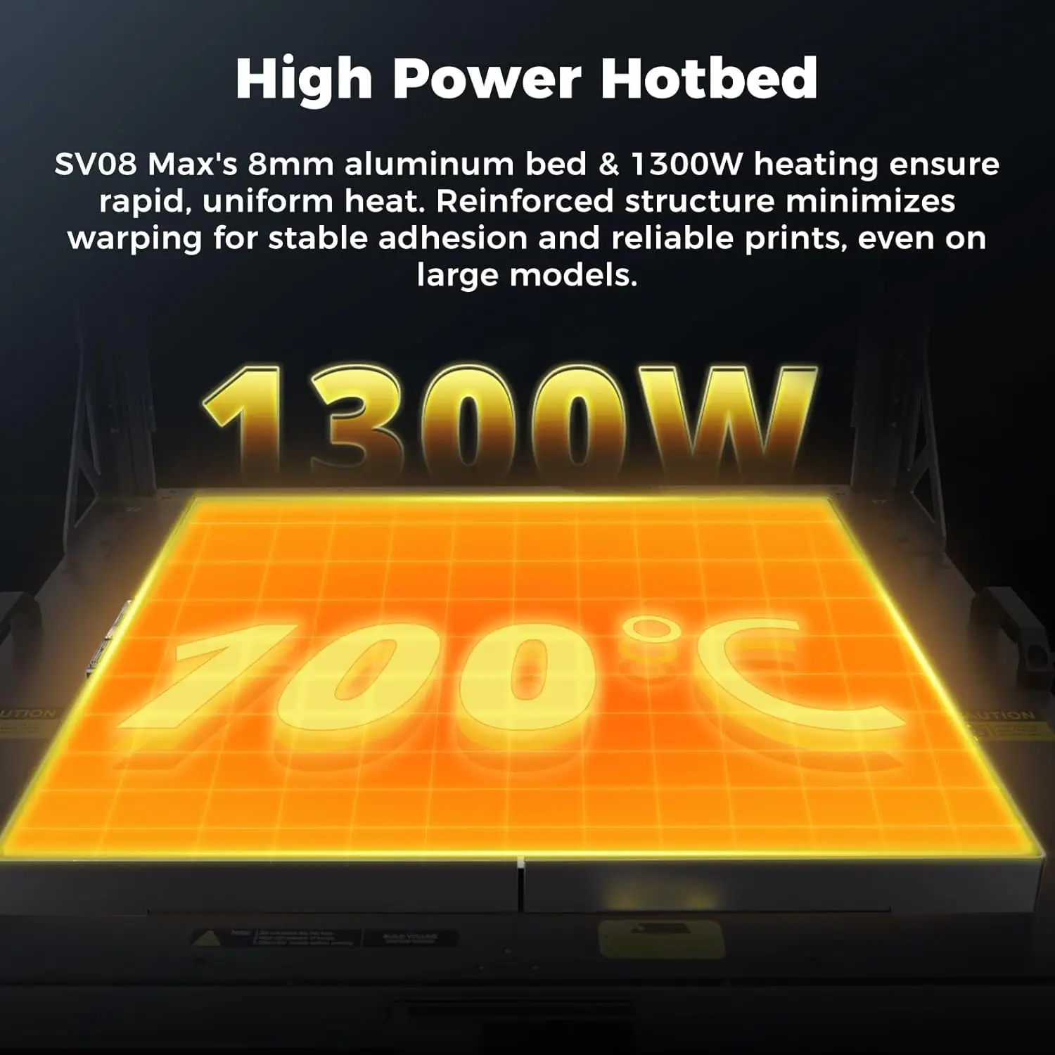 • Thickened Hotbed: Equipped with a 8mm thick aluminum bed and 1300W of power, the SV08Max’s hotbed delivers rapid and even heating across the entire surface. The reinforced structure minimizes warping, ensuring consistent adhesion and reliable prints — even on large models