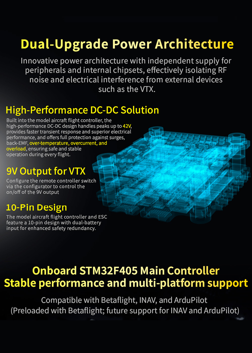 8. The high-performance DC-DC design handles peaks up to 42V,9V Output for VTX,10-Pin Design,design with dual-battery input for enhanced safety redundancy.