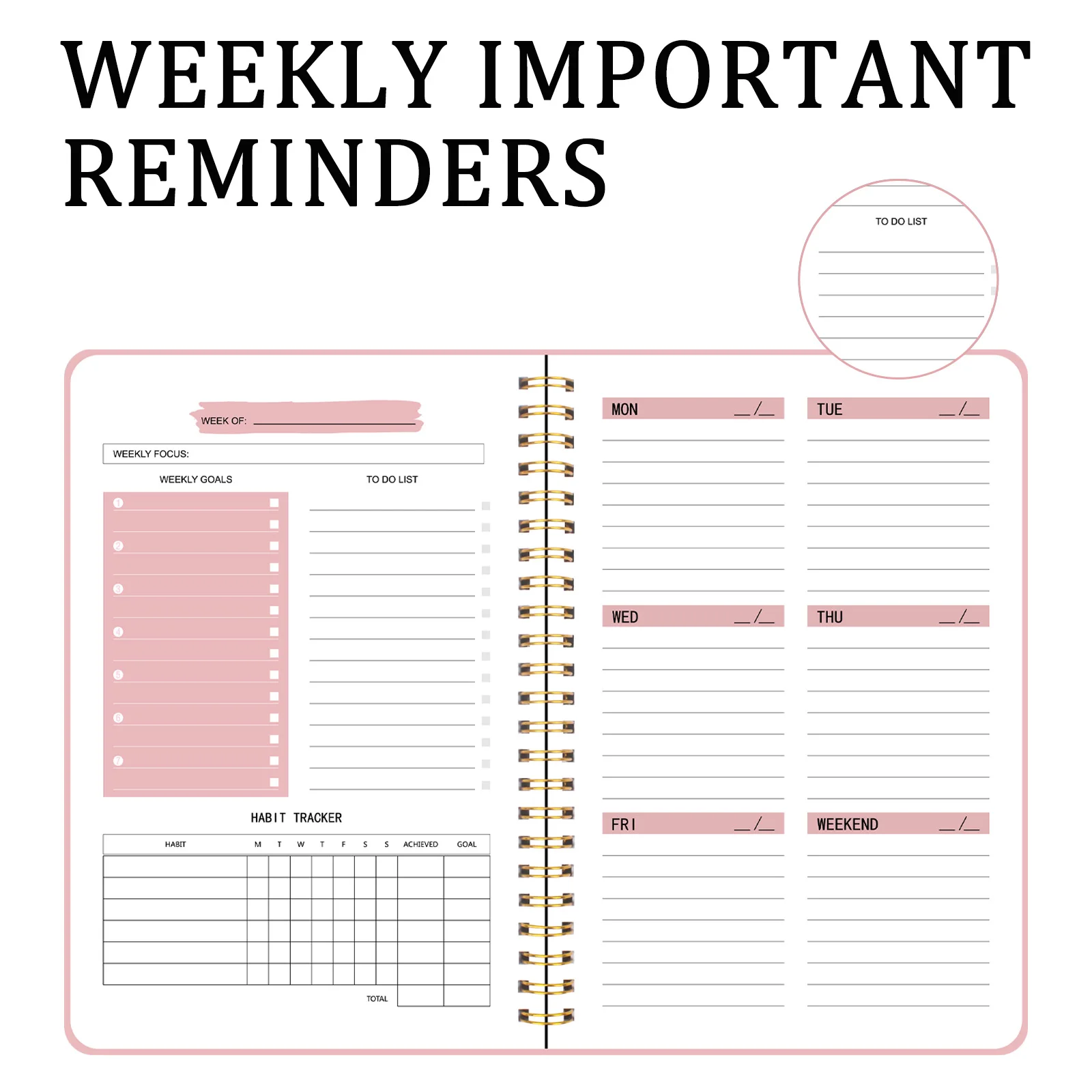 Designed as a weekly planner, it helps in managing time effectively and achieving daily goals.