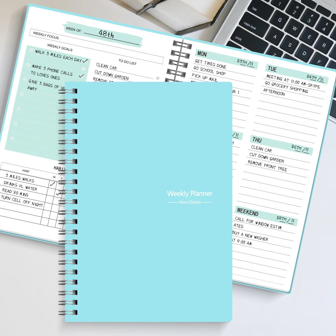 The undated spiral binding allows for flexible planning, making it perfect for any schedule.