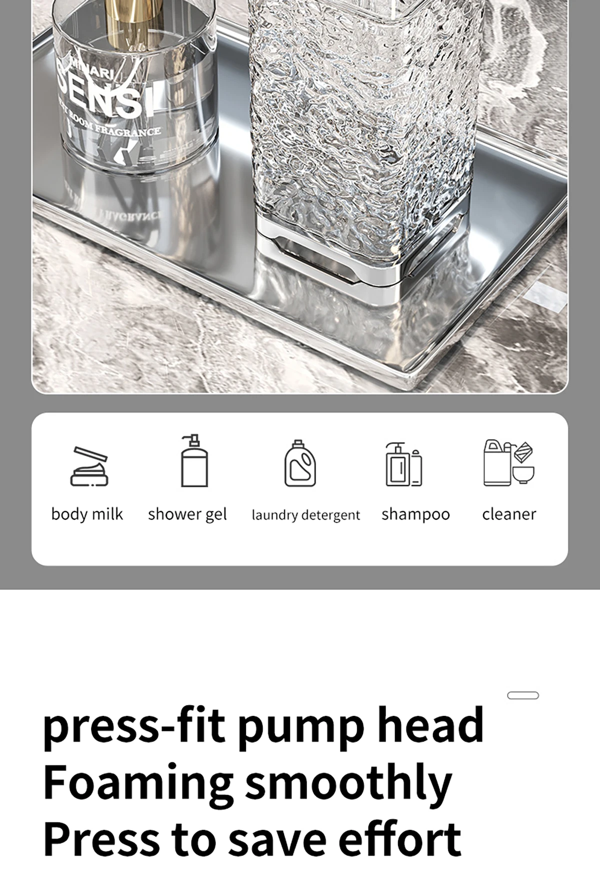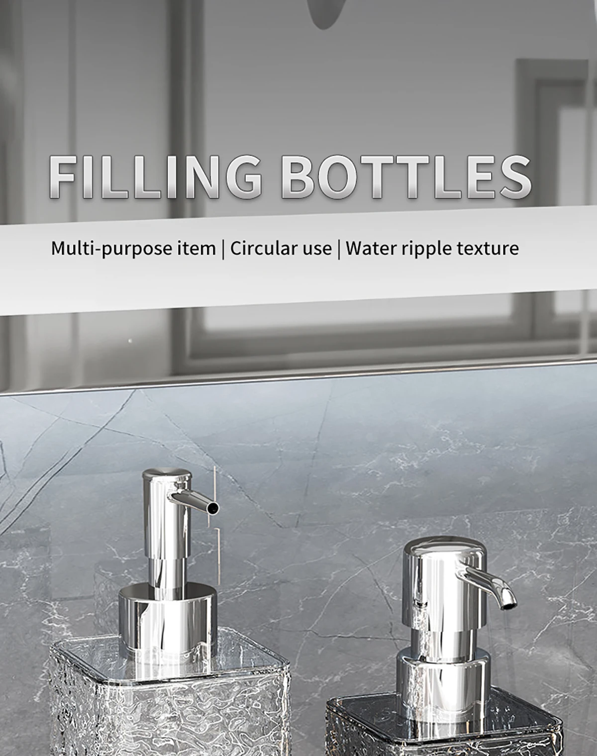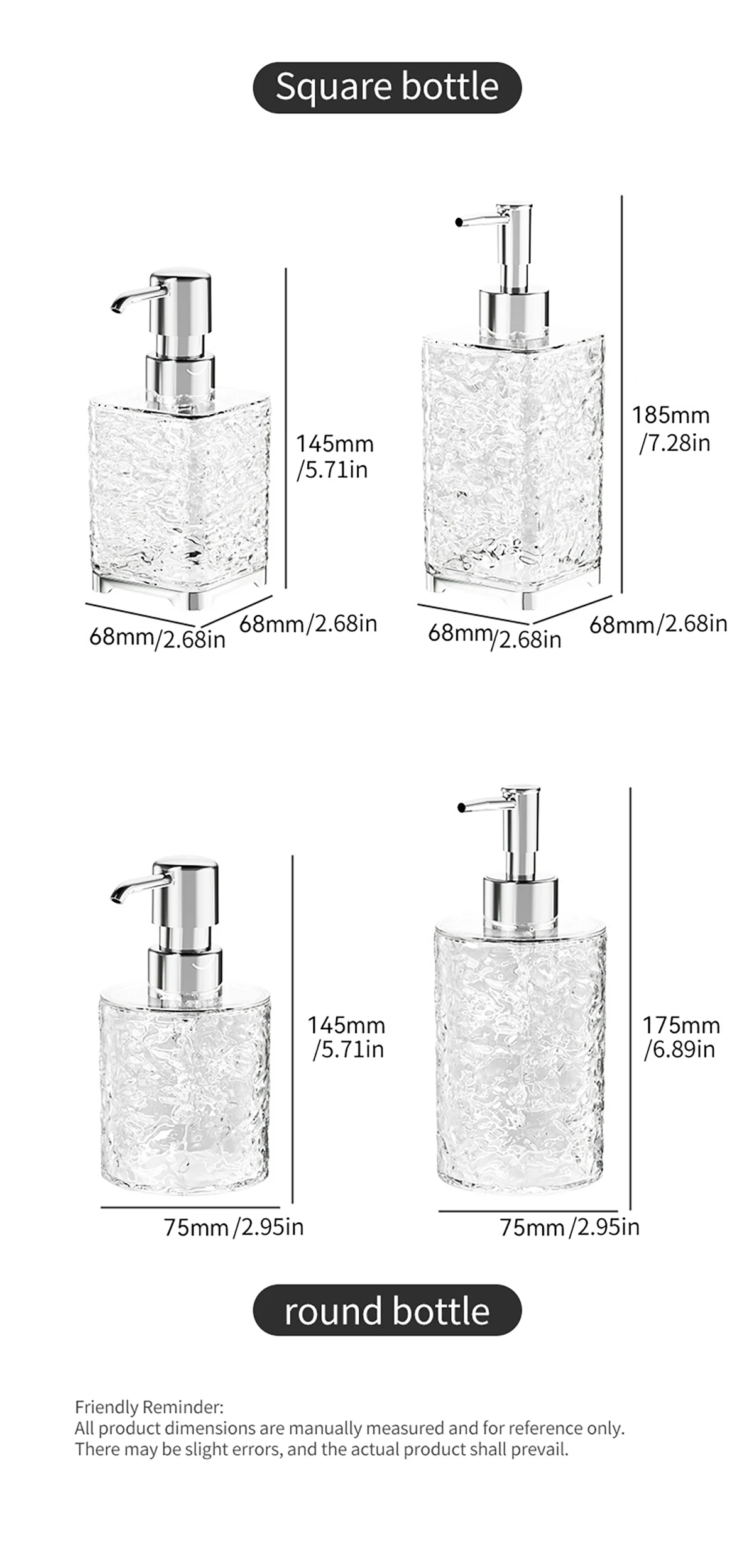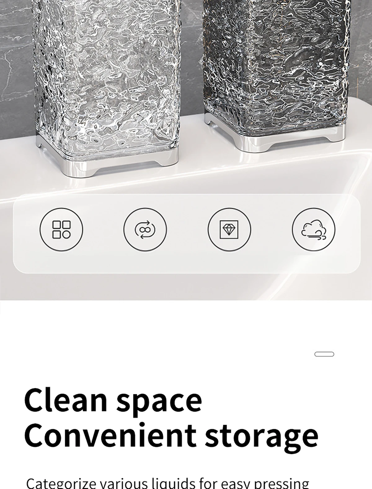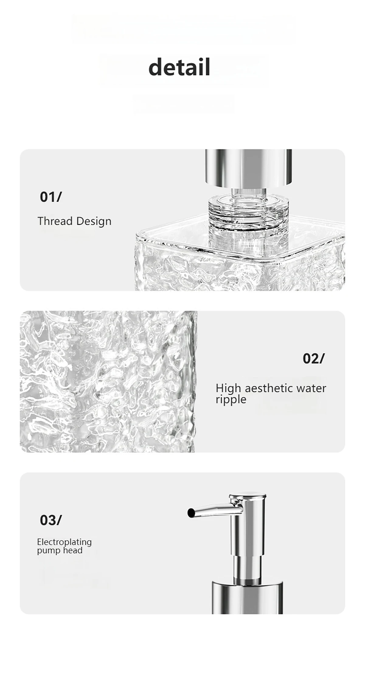 Application: Suitable for kitchen, bathroom and other places, can be used to contain hand soap, detergent, shower gel and other liquids.