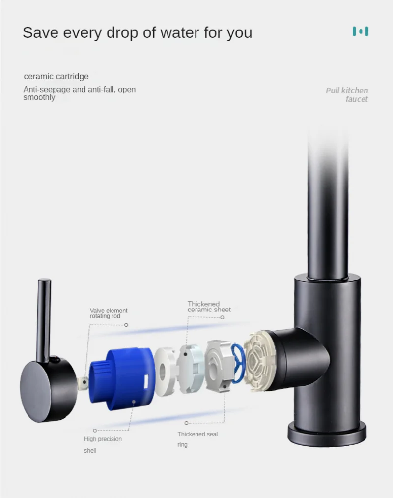 The large bend of this faucet is wrapped with high-quality ABS plastic inner pipe and stainless steel outer surface, Weight, lightweight, and the switch adopts a ceramic valve core, which is durable!