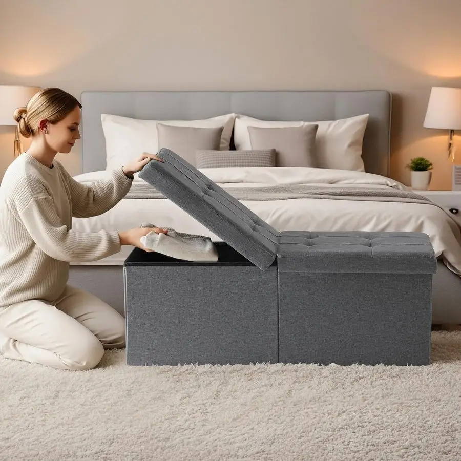 SpaceSaving DoubleGrid Storage Perfectly sized at 35 x 13 x 13, this ottoman fits effortlessly at the foot of the bed, by the wardrobe, beside the sofa, or in the entrywaycompact but surprisingly spacious for all your daily essentials. Collapsible design folds flat in seconds, tuck it into a cabinet when not in use to keep your space open and organized
