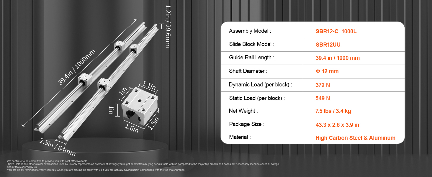 SBR12-1000 mm Linear motion guide rail includes 2 x 39.4 in/1000 mm length SBR12 guide rails and 4 x SBR12UU slide blocks. Dynamic Load Per Block: 372 N, Static Load Per Block: 549 N.