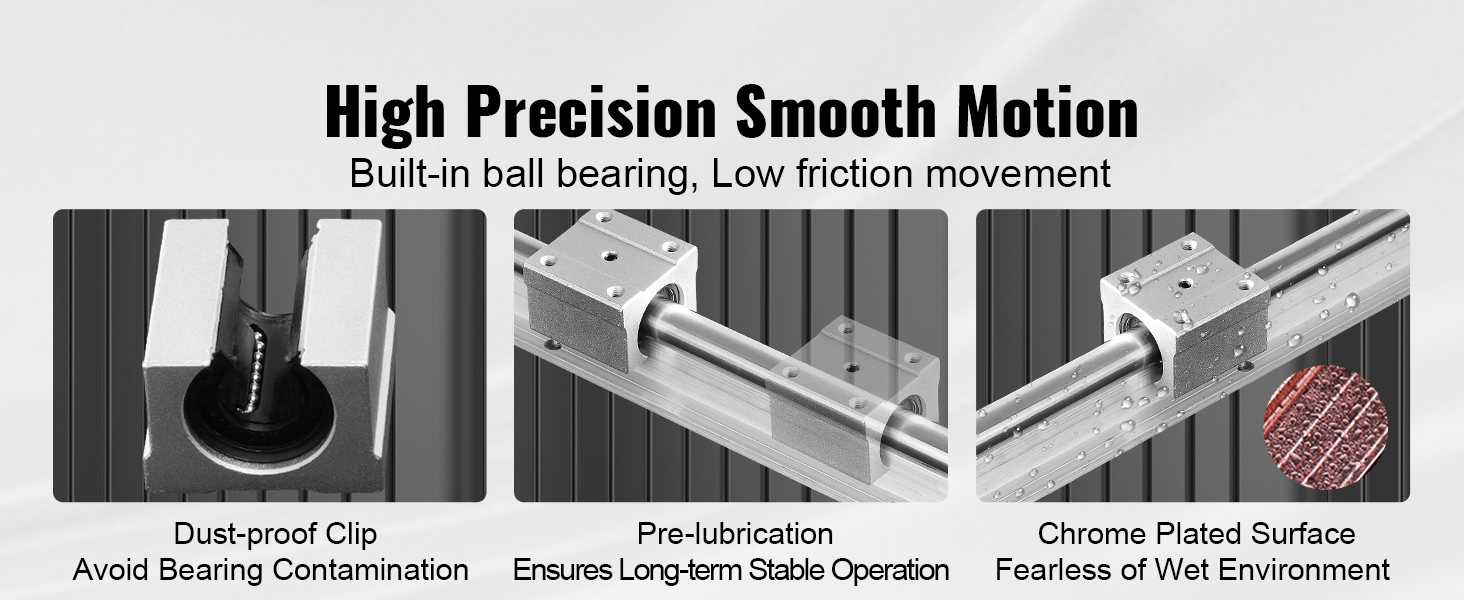 【Durable and Long-Lasting Construction】:Made from carbon steel and aluminum, the linear rails feature a chrome-plated surface for enhanced rust resistance and durability. The set includes four aluminum slide blocks with ball bearings for smooth and consistent sliding performance.