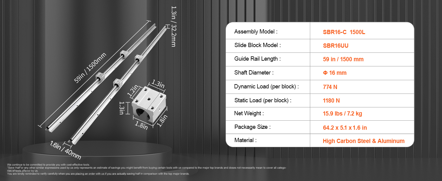 SBR16-1500 mm Linear motion guide rail includes 2 x 59 in/1500 mm length SBR16 guide rails and 4 x SBR16UU slide blocks. Dynamic Load Per Block: 774 N, Static Load Per Block: 1180 N.