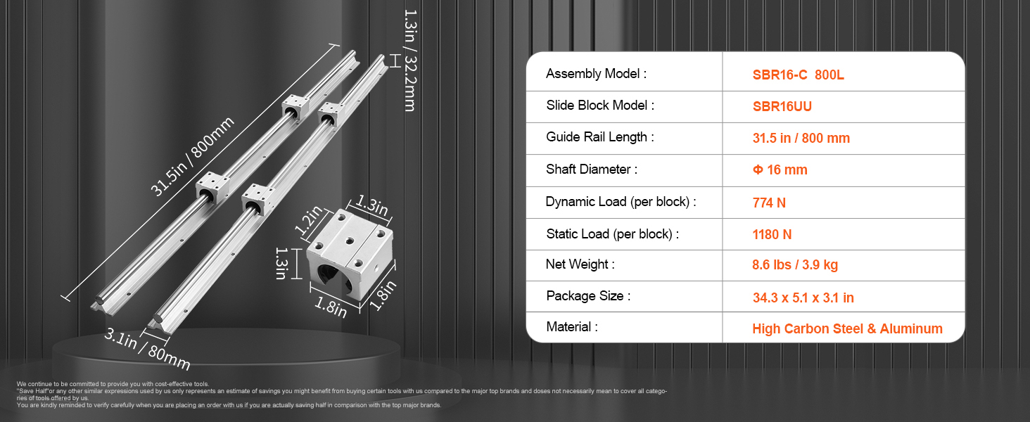 SBR16-800 mm Linear motion guide rail includes 2 x 31.5 in/800 mm length SBR16 guide rails and 4 x SBR16UU slide blocks. Dynamic Load Per Block: 774 N, Static Load Per Block: 1180 N.