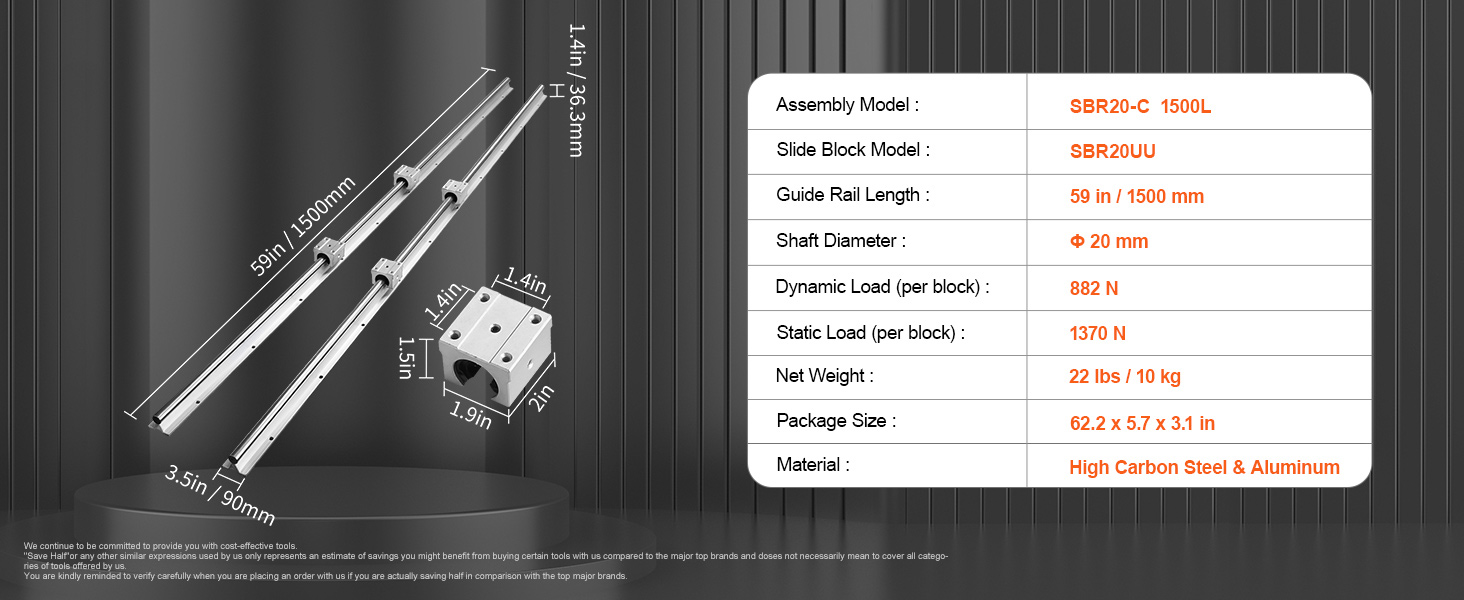 SBR20-1500 mm Linear motion guide rail includes 2 x 59 in/1500 mm length SBR20 guide rails and 4 x SBR20UU slide blocks. Dynamic Load Per Block: 882 N, Static Load Per Block: 1370 N.