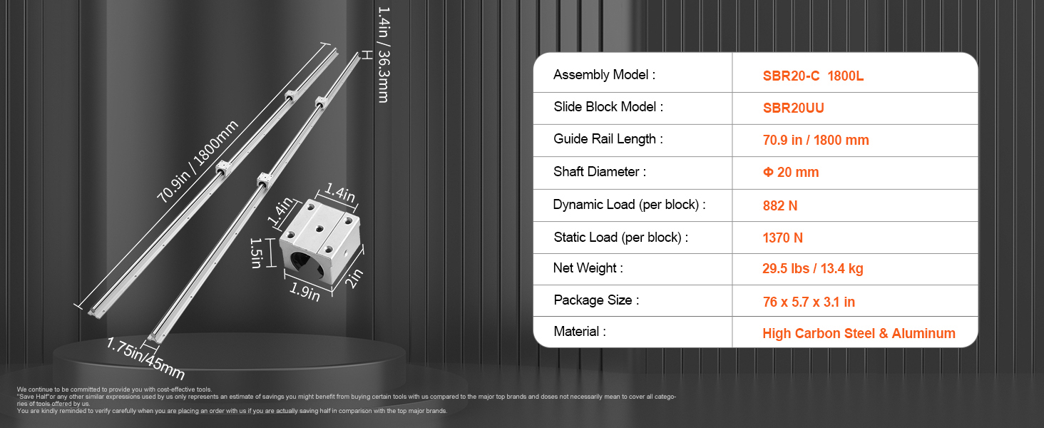 SBR20-1800 mm Linear motion guide rail includes 2 x 70.9 in/1800 mm length SBR20 guide rails and 4 x SBR20UU slide blocks. Dynamic Load Per Block: 882 N, Static Load Per Block: 1370 N.