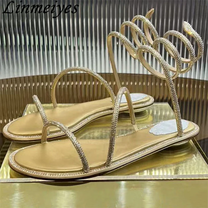 Summer Gladiator Sandals Woman Rhinestone Snake Twine Around Ankle Strap Wedding Party Shoes Women Flat Sandals Women Sandalias
