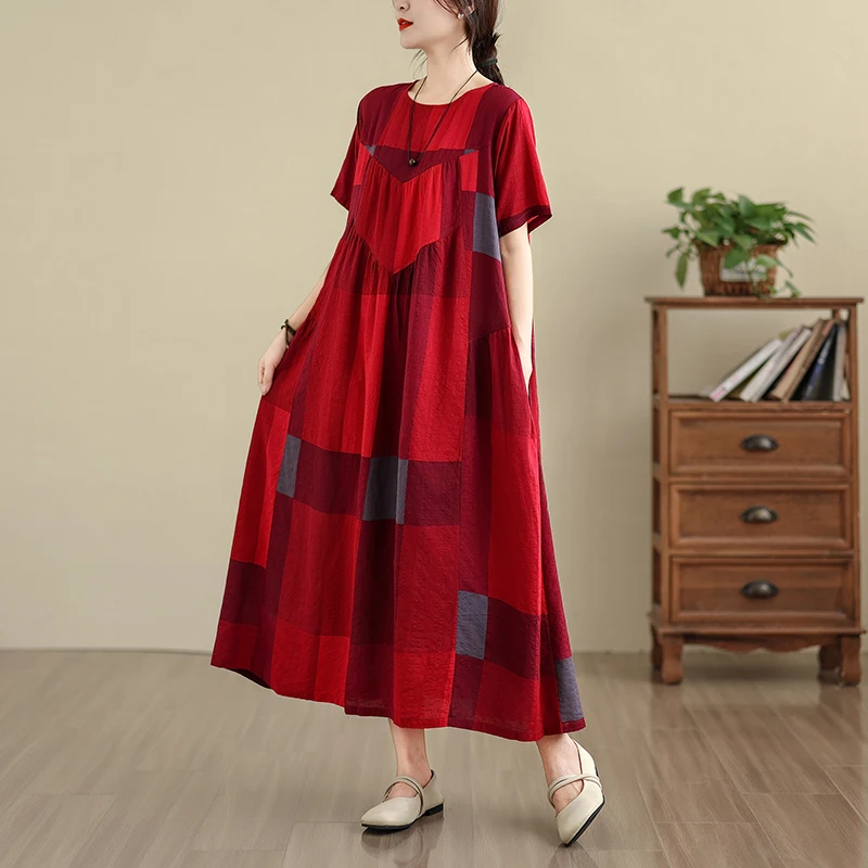 The red plaid pattern adds a classic touch to the dress, making it a versatile piece that can be dressed up or down.