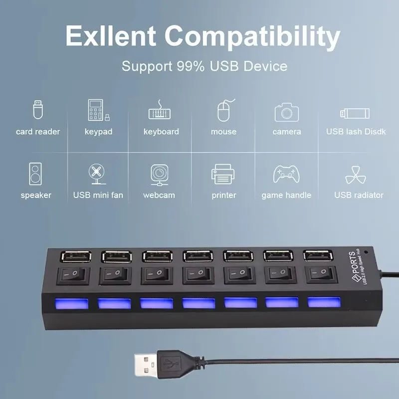 External USB2.0 seven port hub with built-in current protection device, effectively protecting the connected equipment and HUB itself.