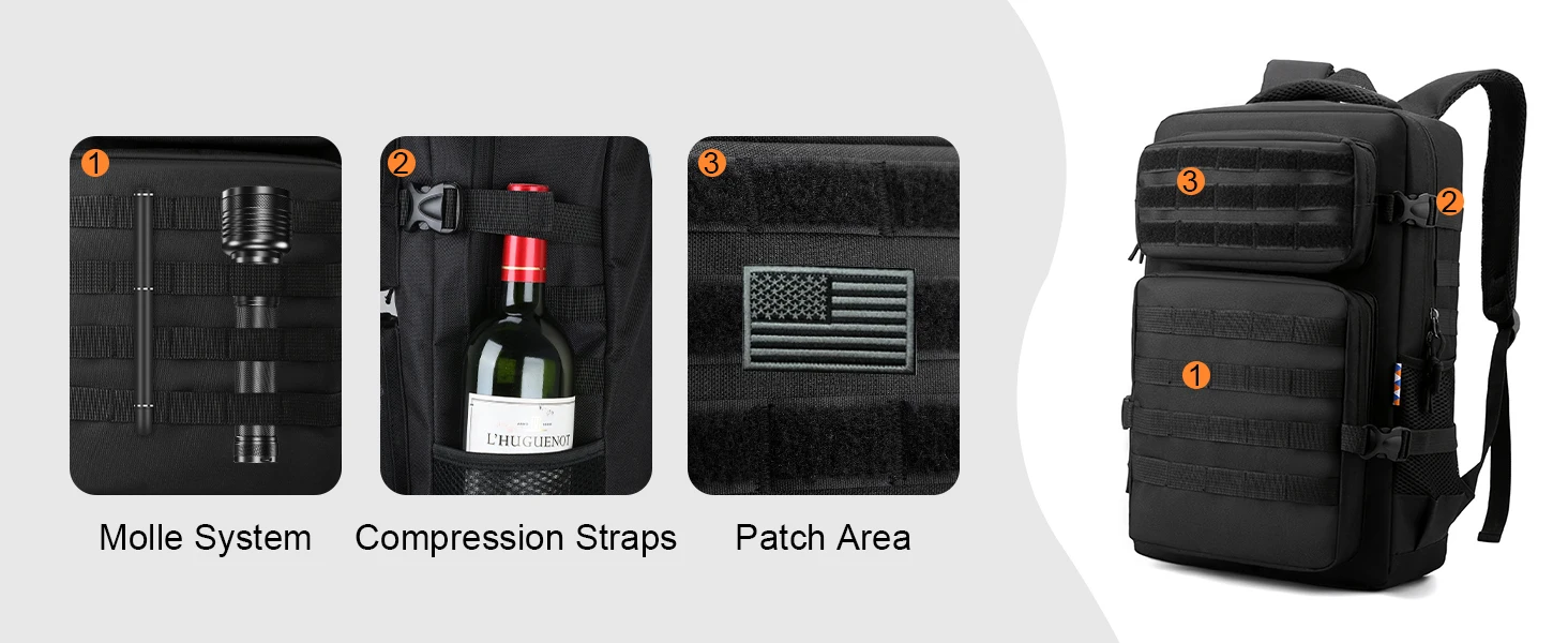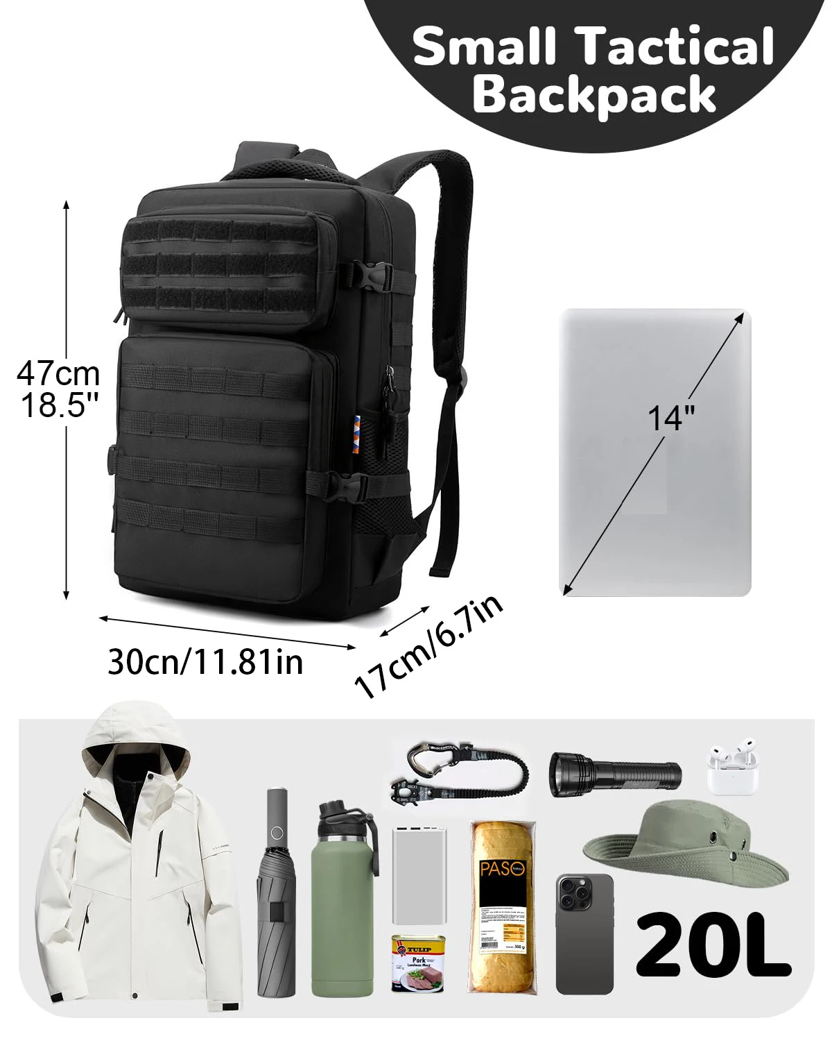Small Tactical backpack: Measuring 47*30*17cm/18.5"*11.8"*6.7", this backpack is equipped with dual side compression straps for helping tighten your load. Molle webbing throughout for attaching additional tactical, such as glasses, interphone, carabiner. The patch area on the top for DIY your favorite patches.