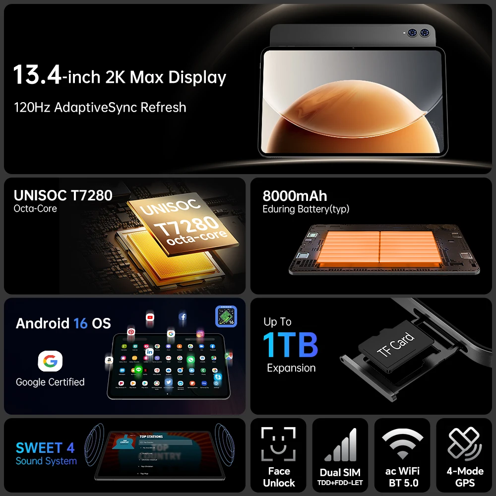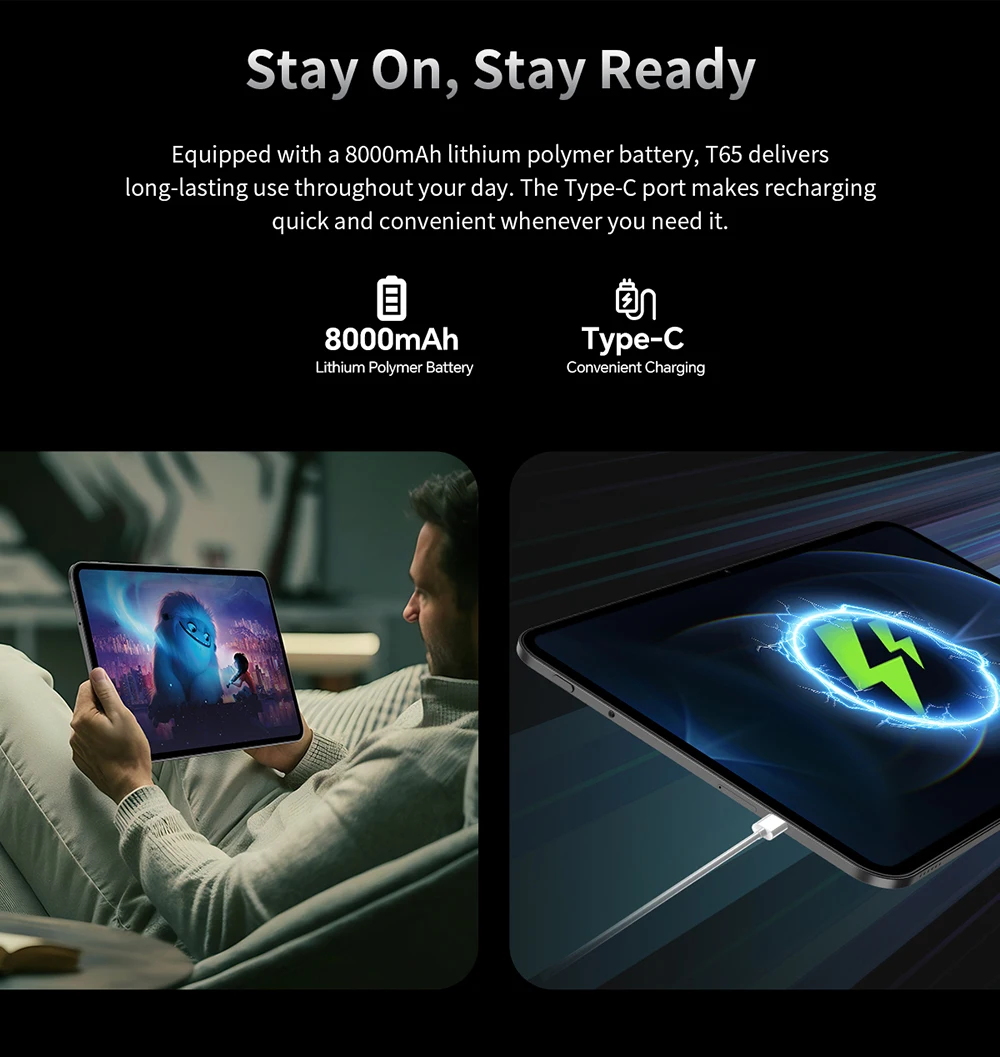 Meet the T65: your truly global tablet. This versatile device supports dual SIM cards for reliable 4G connectivity worldwide, or use one slot for a SIM and the other for up to 1TB of expandable storage. Running the latest Android 15 with full Google Play access and Widevine L1 certification, it unlocks HD streaming on platforms like Netflix. The stunning 13.4-inch 2K display, with a 120Hz refresh rate, delivers an exceptionally smooth and immersive viewing experience, making the T65 an ideal choice for movies and series.