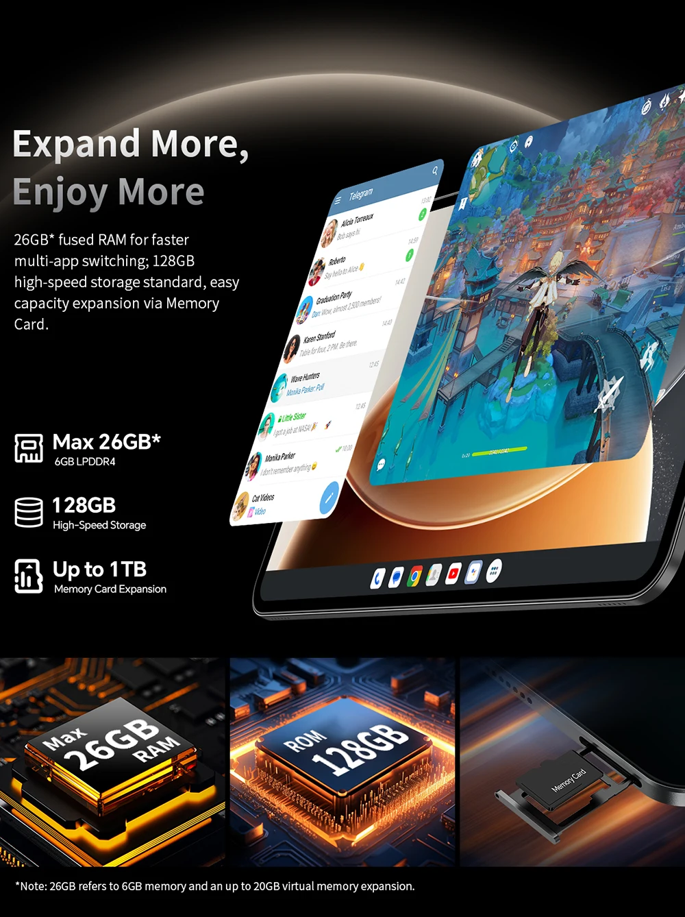 RAM&ROM: Max 26GB RAM (6+20GB virtual expansion), 128GB /256GB ROM