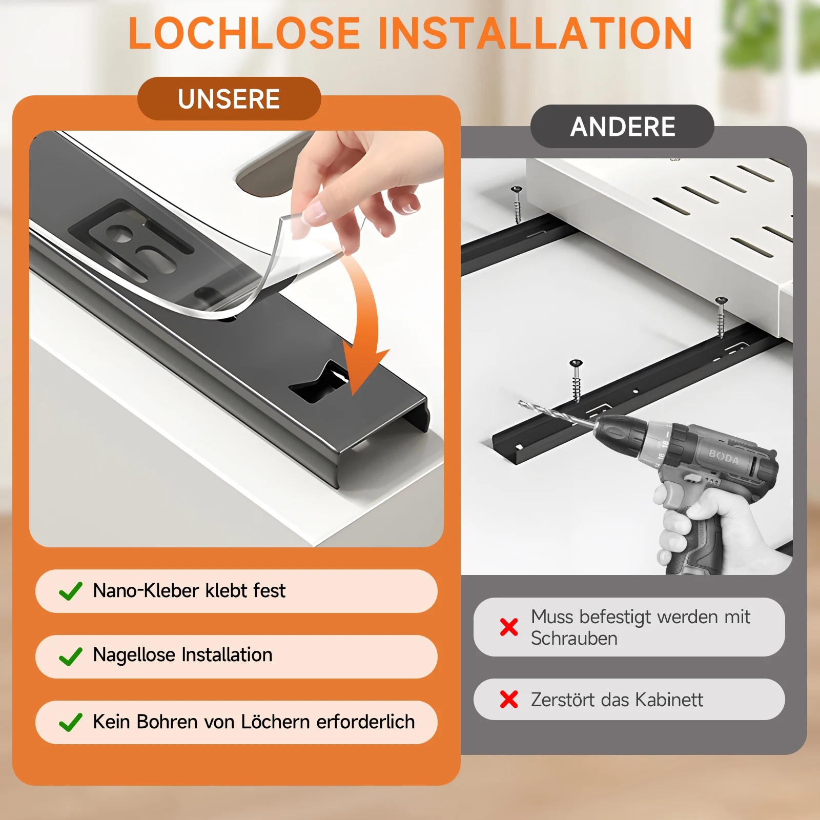 After measuring the assembly distance, the drawer can be glued directly to the cabinet with the supplied tape without drilling and screws. Alternatively, the drawers can be screwed to the cabinet with the attached fastening elements.