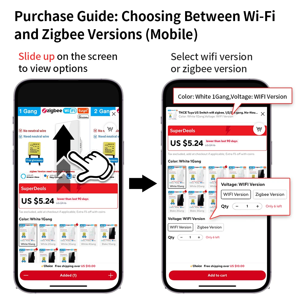 - About WIFI and zigbee options: Default WIFI Version, slide up to display WIFI and zigbee options.If there is no zigbee option, the default is the WIFI version.