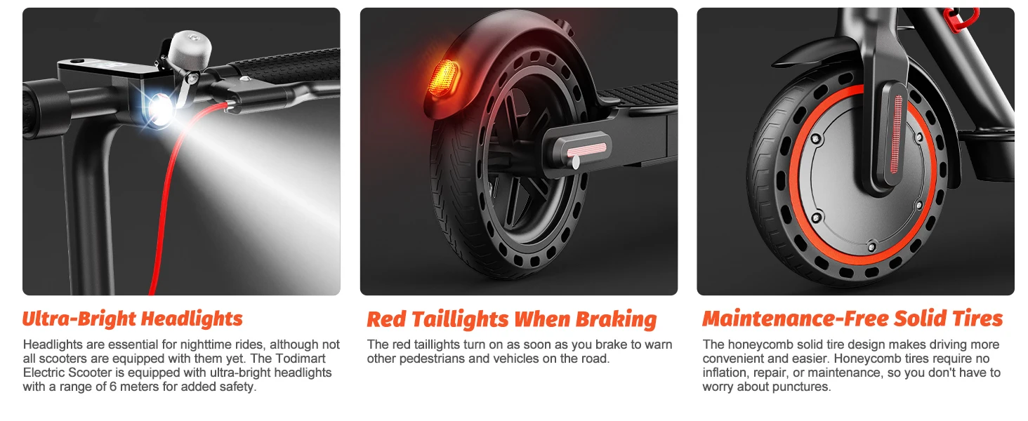 ✨【SAFETY & COMFORT】This model is equipped with 8.5-inch solid tires. Solid tires offer low starting resistance and eliminate the risk of air leaks or blowouts. They provide enhanced safety, durability, and puncture resistance. Equipped with excellent mechanical disc brakes, the electric scooter provides a smooth and comfortable riding experience. LED headlights and rear brake lights provide added safety when riding at night.