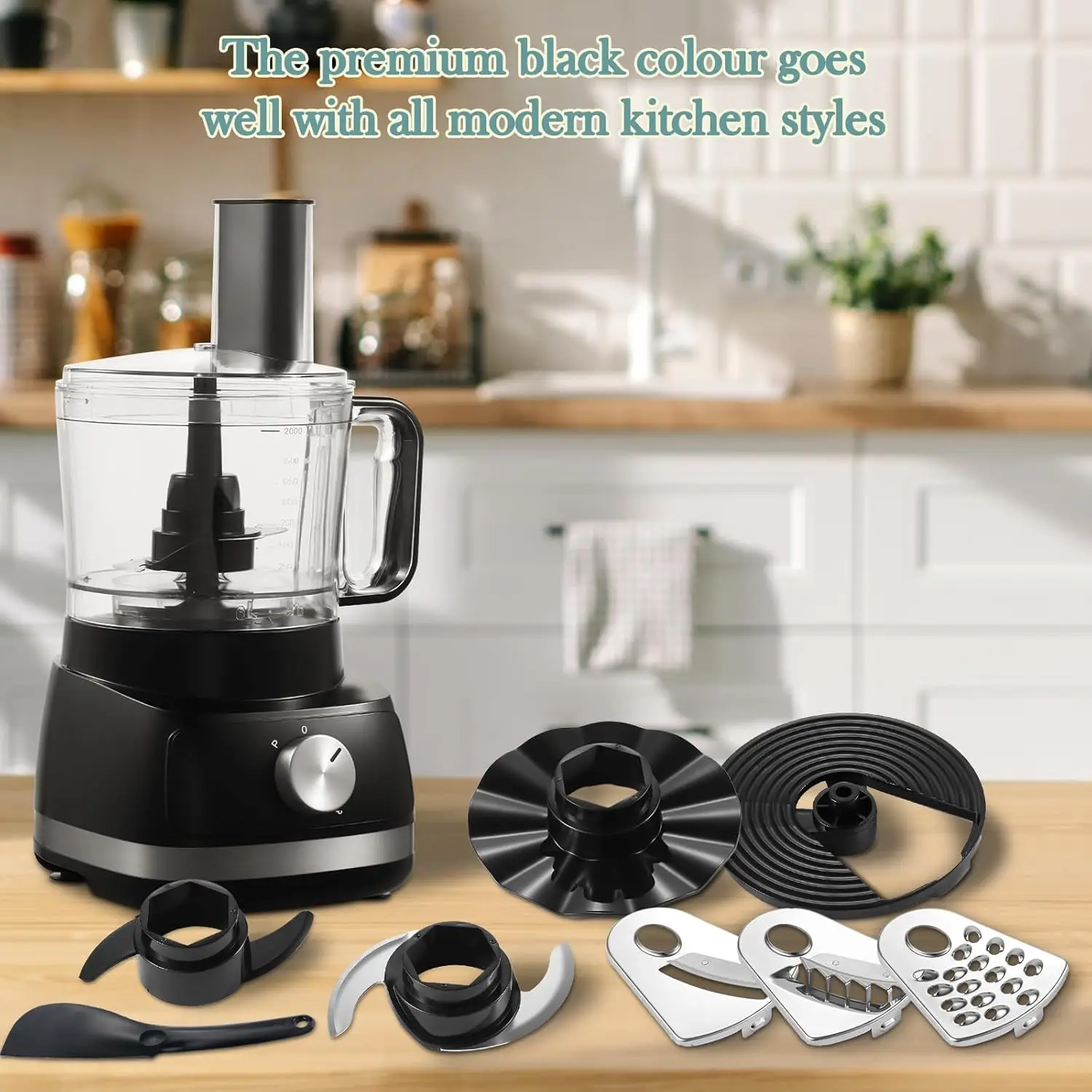 - Accessories: Chopping / Mixing Blade,Dough Blade,Full-Size Feed Tube,Locking Lid,Shredding Disc,Slicing Disc,Spatula