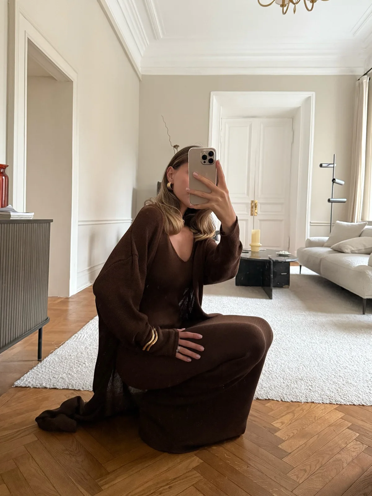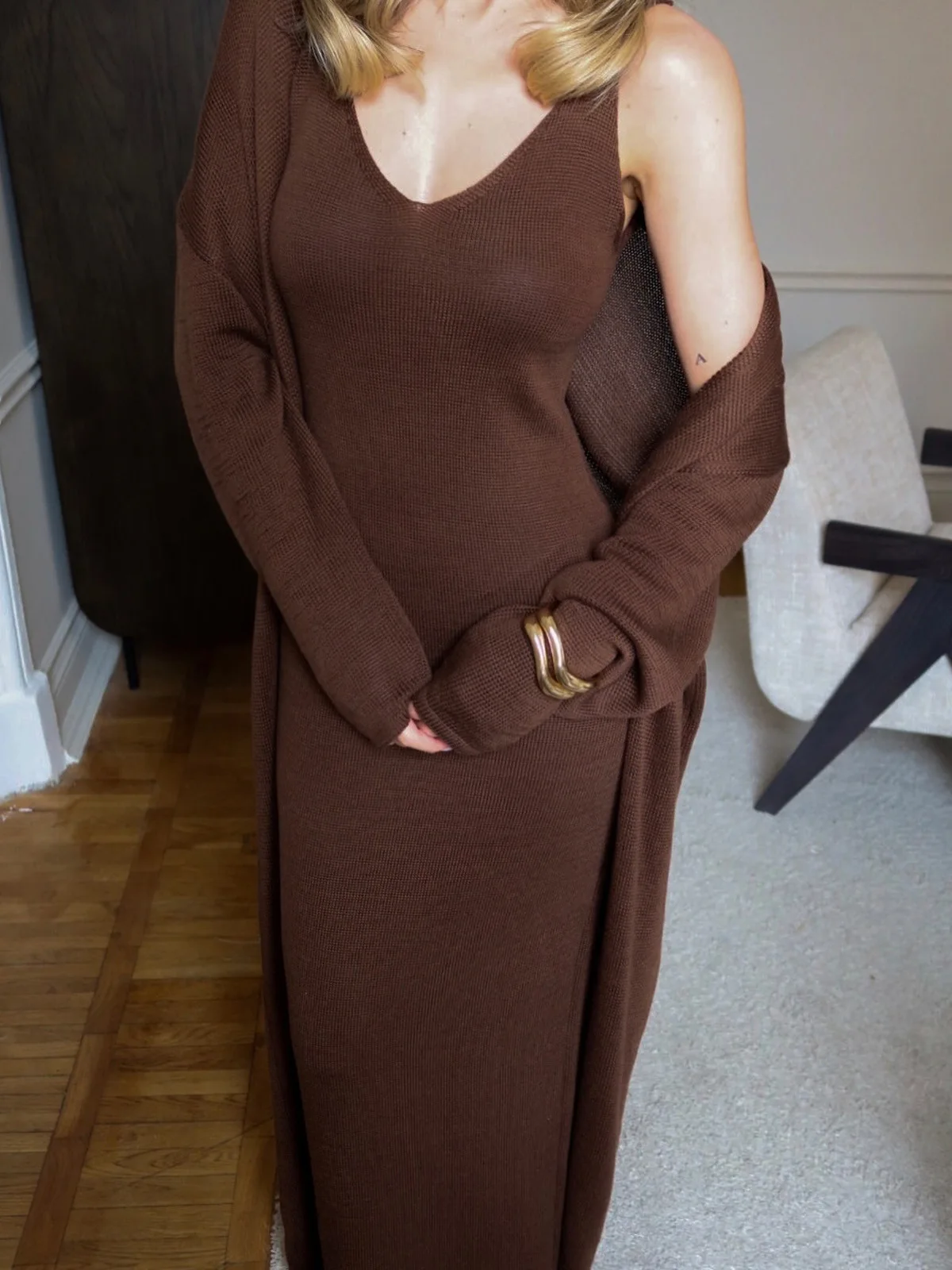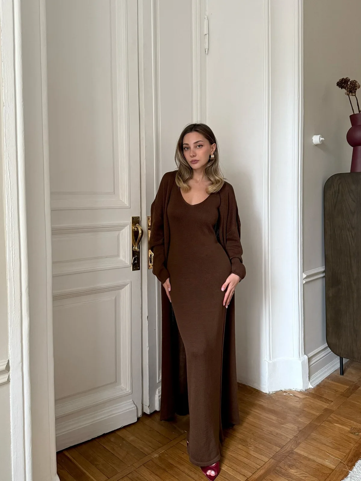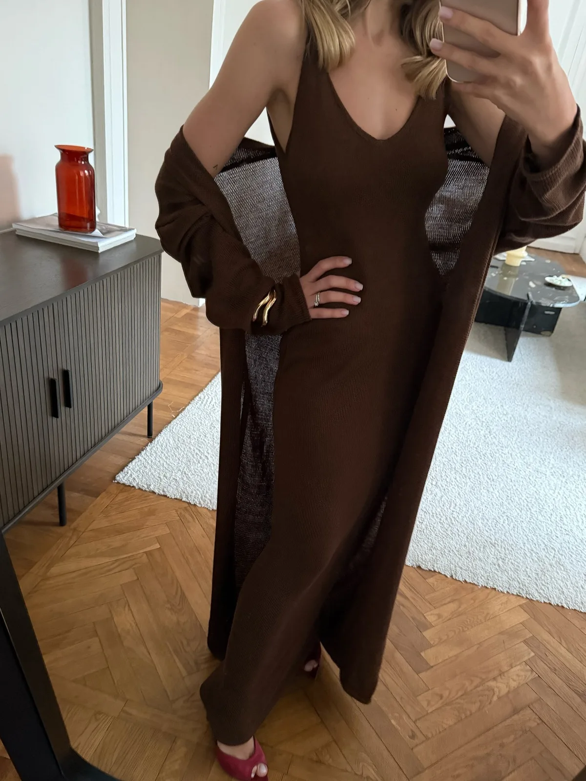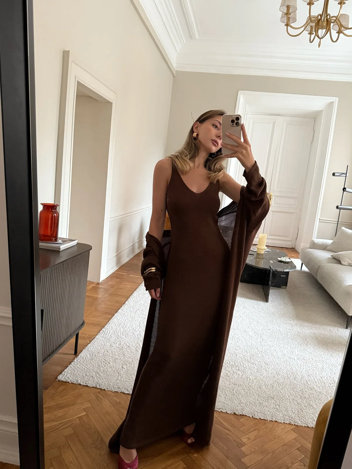 The color is different from the photo; it’s closer to reddish-brown, not coffee-colored. There are no complaints about the stitching; there are no loose threads, everything is neat.