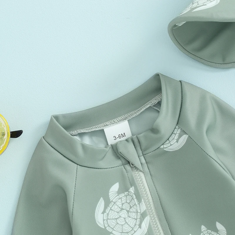 Toddler Boys Rash Guard Swimsuit Rompers Long Sleeve Turtle/Dinosaur Print Baby Bathing Suit Swimwear with Swim Cap