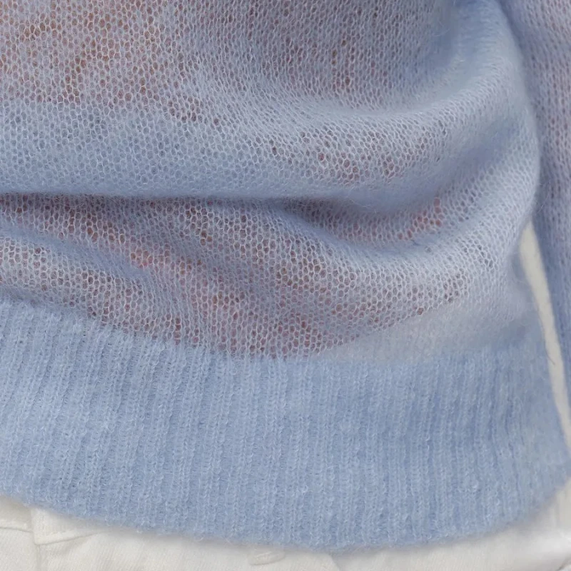 A nice sweater, soft to the touch, with a gentle blue color. Pleasant against the skin. Just how I imagined it would be.