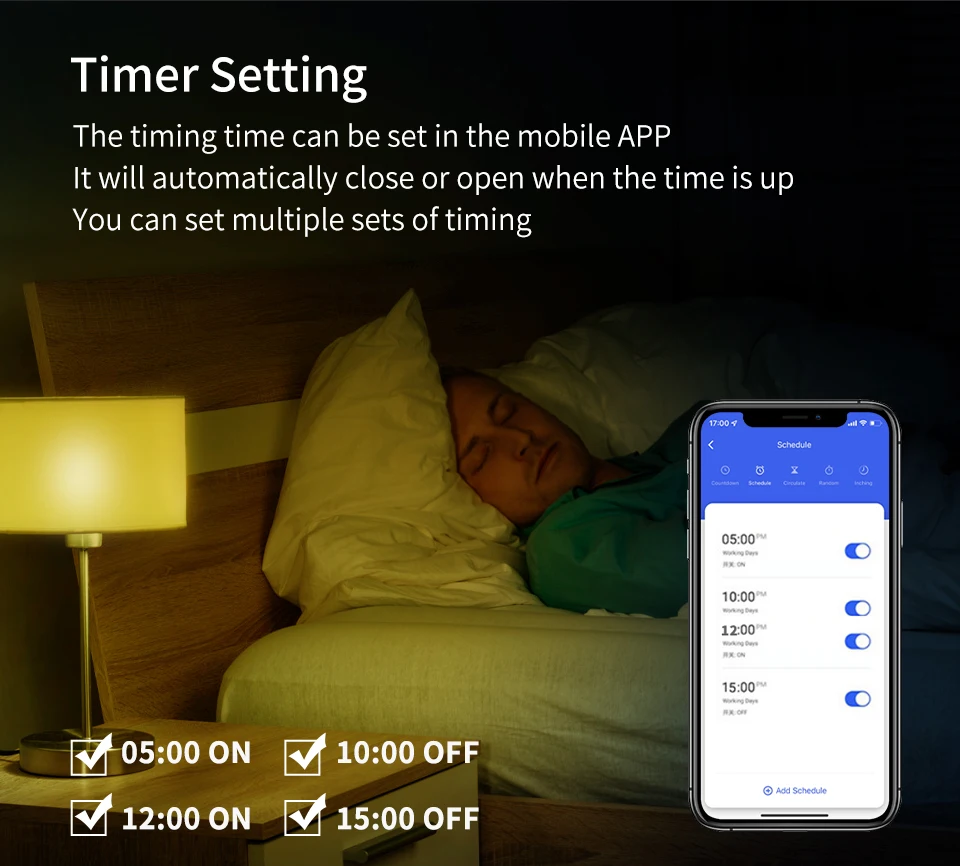 4. Timed Settings: Set a schedule or timer to turn the lights on/off at night and in the morning, then when you get home at dusk, you'll never be back in a dark house. Plus, you can wake up peacefully with a predetermined light every morning.