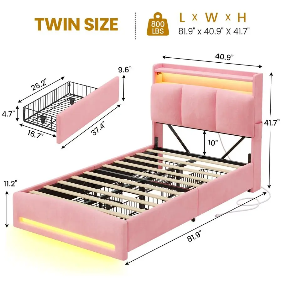 Storage Headboard with Charging StationThe twin bed frames with headboard is equipped with a builtin charging station, including 2 AC Outlets, a USB port and a typeC port, allowing you to charge various electronic devices within easy reach. 2Tier Storage shelf and hidden storage compartment on the headboard can provide more storage space, making it convenient for you to place commonly used items such as magazines, phones, alarm clocks, etc.