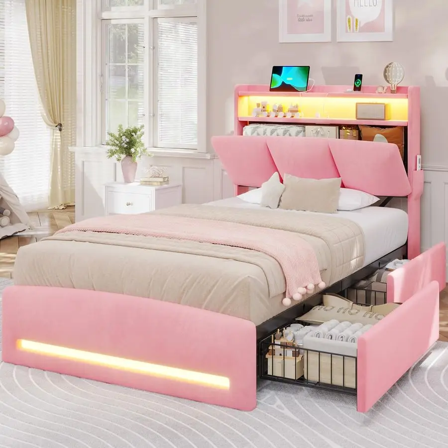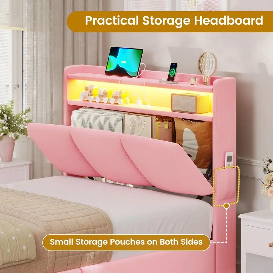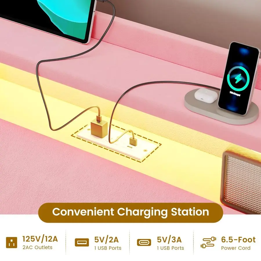 Storage Headboard with Charging StationThe twin bed frames with headboard is equipped with a builtin charging station, including 2 AC Outlets, a USB port and a typeC port, allowing you to charge various electronic devices within easy reach. 2Tier Storage shelf and hidden storage compartment on the headboard can provide more storage space, making it convenient for you to place commonly used items such as magazines, phones, alarm clocks, etc.