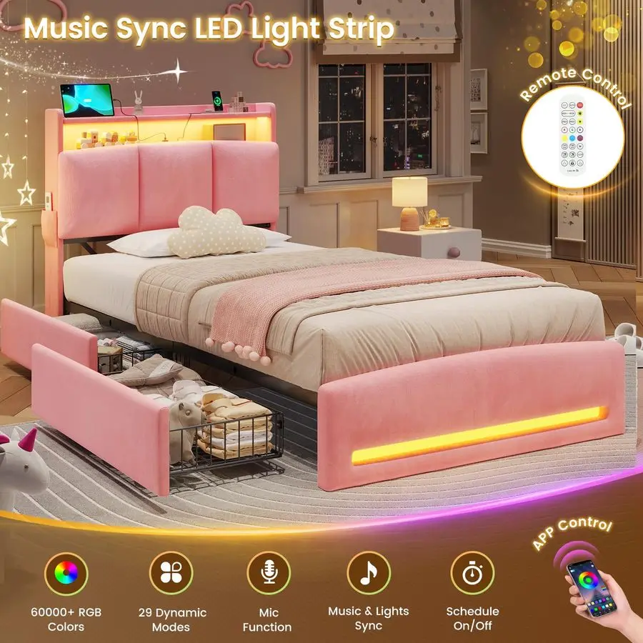Music Sync LED Light StripElevate your bedroom ambiance with this music sync RGB LED light strip on both headboard and footboard. Provided over 60000 colors, 29 dynamic changing modes and included remote control or APP, this twin bed frame with led lights can create a lively atmosphere or a relaxing environment. The lights pulsating with the music rhythm add an extra layer of atmosphere and emotion, making the moment truly unforgettable.