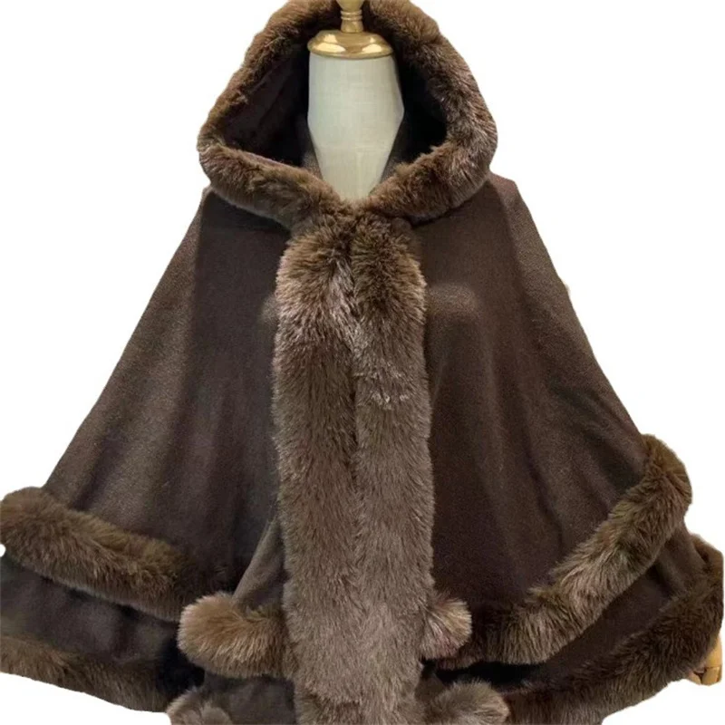 Two Circle Faux Rabbit Fur Outer Shawl Cloak Winter Warm Oversize Long Poncho Capes Women Wear Loose Overcoat With Hat