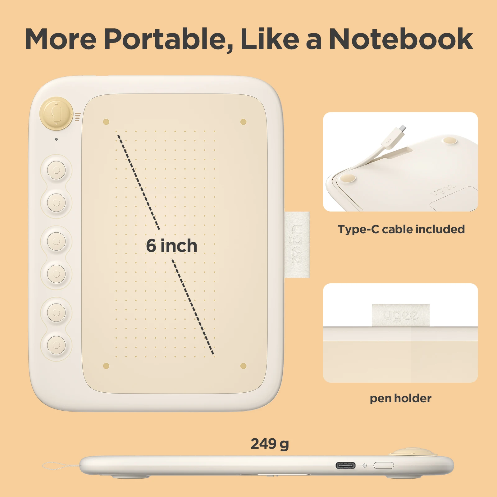 The ugee Q6 comes with a built-in Type-C cable that features a detachable design. You can easily detach or store the cable, eliminating the need for additional cables or adapters.
