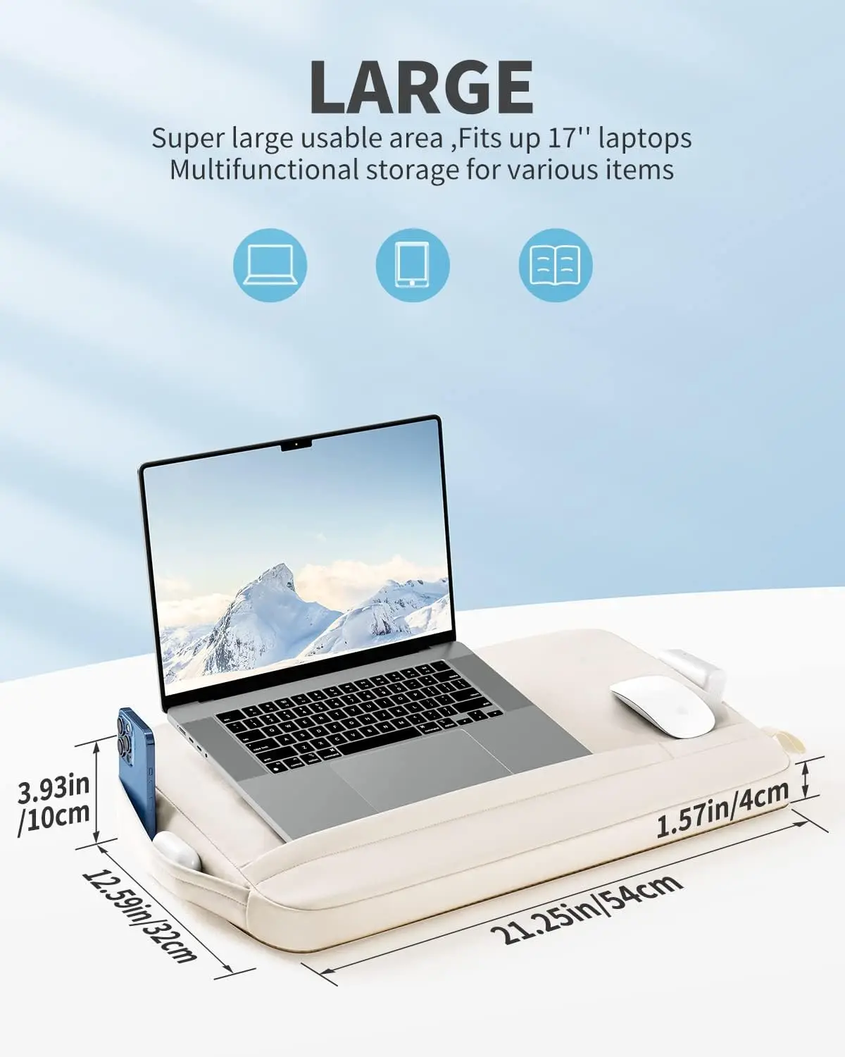 【Ultra Lightweight Design】Experience unparalleled comfort with this lap desk’s feather-light construction. Weighing only 480 grams, it feels almost weightless on your lap, eliminating pressure and fatigue during extended work or leisure sessions. The lightweight nature ensures you can use it for hours without discomfort, making it ideal for remote work, studying, or relaxing at home. 【Portable and Versatile】Designed with a convenient handle and compact form factor, this lap desk is easy to carry anywhere—from your living room couch to your bed or favorite chair. Its portability allows you to create a comfortable workspace in any setting, whether you’re traveling, working from home, or simply enjoying a movie night. Take it with you on trips or move it around the house effortlessly. 【Perfect Fit for Your Devices】With surface dimensions of 21.3 inches by 12.6 inches, this lap desk provides ample space to accommodate laptops up to 17 inches in size, including popular models like the MacBook Air. The textured cover offers a smooth surface that works well for both typing and using a mouse without the need for an additional mouse pad. It’s designed to hold your laptop securely while giving you room for accessories. 【Enhanced Cooling Features】Equipped with high-quality silicone rails underneath the desk surface, this product promotes better airflow around your laptop. These rails create a cooling space that helps dissipate heat efficiently, reducing the risk of overheating during prolonged use. This feature not only protects your device but also enhances performance by maintaining optimal temperatures. 【Easy Maintenance and Durability】The washable design includes a zipper that allows you to easily remove the cushion cover for cleaning. Simply unzip and machine-wash the cover to remove stains or spots, keeping your lap desk fresh and hygienic over time. This practical feature ensures long-lasting use and makes maintenance straightforward without compromising comfort. 【Ideal for Various Activities】Whether you’re working on important projects from home, streaming content in bed, or gaming on the couch, this lap desk adapts to multiple scenarios. Its ergonomic design supports comfortable posture while providing stability for your devices. Enjoy improved productivity and relaxation without sacrificing convenience or style.