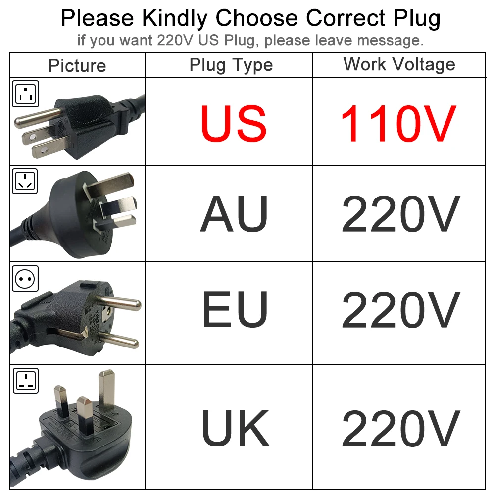 3. Voltage: US Plug — 110v, Â Â EU/UK/AU Plug — 220V
