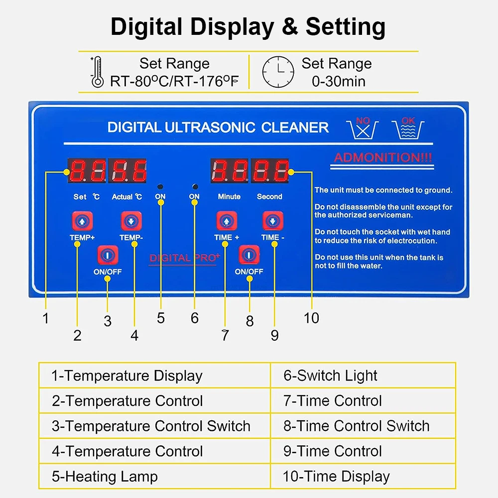 【Easy To Operate】The ultrasonic parts cleaner is controlled by a digital panel, which can precisely control the time and temperature. Time: 0-30mins, temperature: 0-80℃/176℉. A variety of modes meet a variety of cleaning needs, and precise heating makes cleaning more efficient.